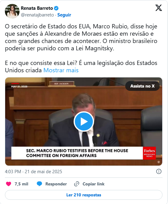 Também nesta quarta-feira, o presidente do STF, Luís Roberto Barroso, se recusou a falar sobre a possibilidade de sanções contra Moraes. “Não aconteceu nada que eu precise comentar.” Os demais ministros também preferiam o silêncio.